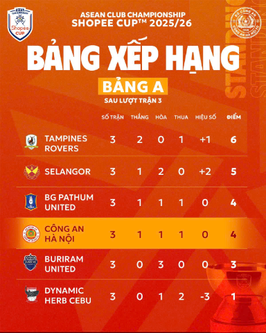 Với kết quả này, CLB Công an Hà Nội hiện có 4 điểm sau 3 lượt trận, tạm xếp thứ 4 tại bảng A nhưng khoảng cách với đội đầu bảng chỉ là 2 điểm. Cuộc đua giành vé đi tiếp vẫn đang rất rộng mở và kịch tính ở những vòng đấu tiếp theo.